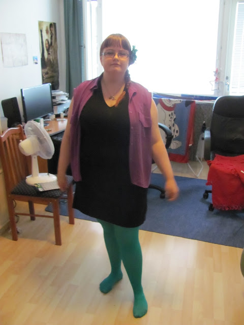 Valot kuvissa ovat vähän sieltä tänne päin. Syynä synkkä päivä, ja tämä meidän ei niin tehokas kamera : D Päällä oli musta reflexin mekko, joka on kirpparilöytö viime syksyltä (istui sllon miule vielä paremmin, kun olin laihempi silloin). Asustin sen vielä BikBokin hihattomalla paidalla, jonka ostin vitosella tällä viikolla, ja samoilla Line-malliston sukkahousuilla, jotka ovat olleet asukuvissa ennenkin. Vielä vanha kunnon hiuskukka messiin,ja miltei ready to go!